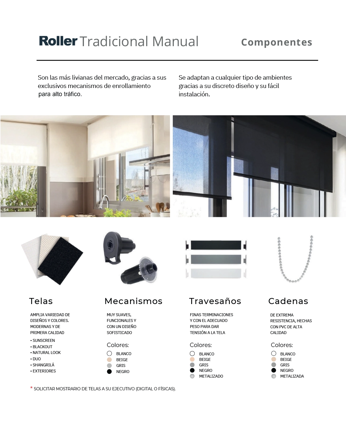 Contamos con 38 colores y diferentes texturas al 1, 3, 5 % de apertura, se fabrican a medida de tus ventanas, su instalación puede ser manual o motorizada.