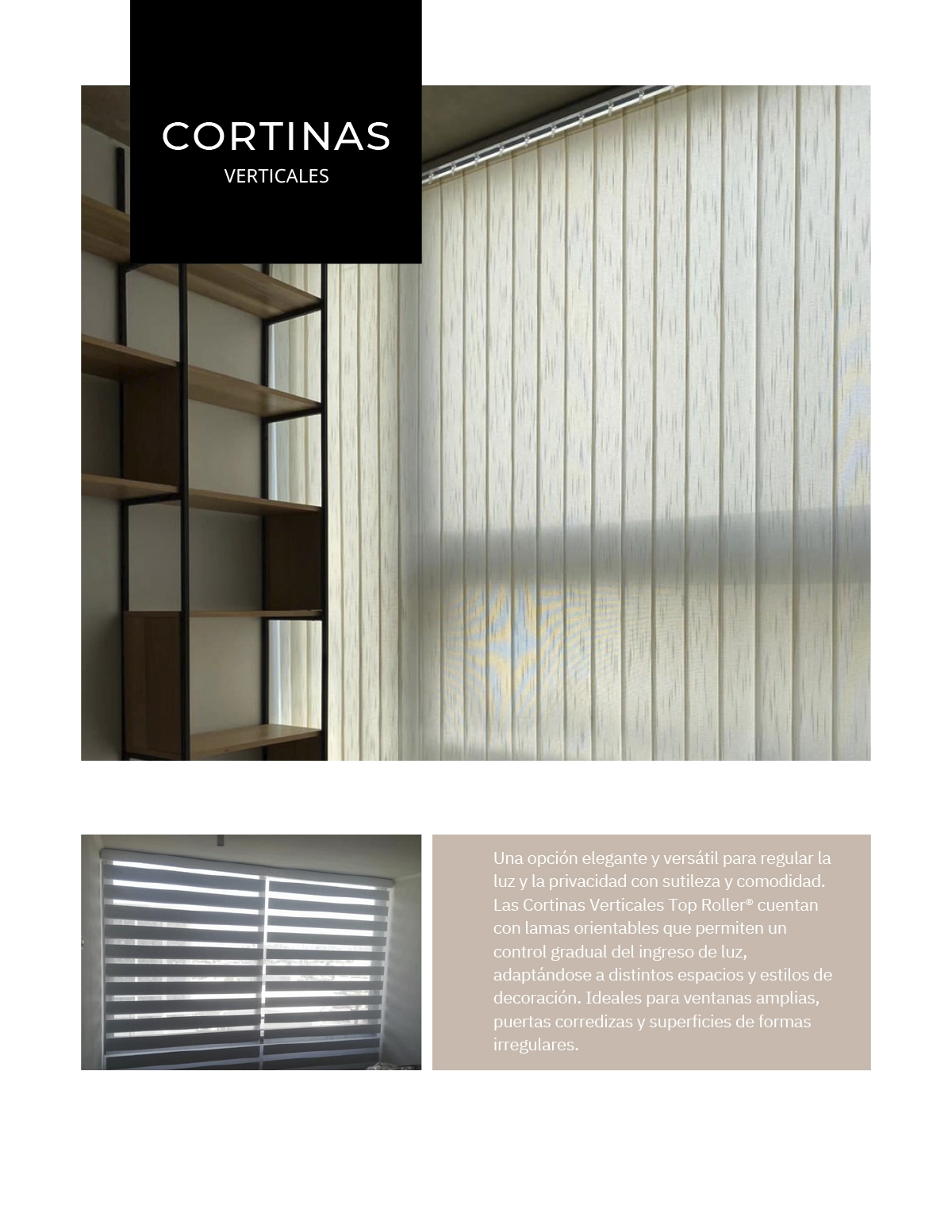 Con un estilo limpio y contemporáneo, este tipo de cortina es ideal para ventanales amplios, puertas correderas o espacios de trabajo, aportando sobriedad y funcionalidad sin perder elegancia. La caída de sus lamas verticales añade sensación de altura y orden visual, transformando cualquier espacio con una estética profesional o residencial refinada.